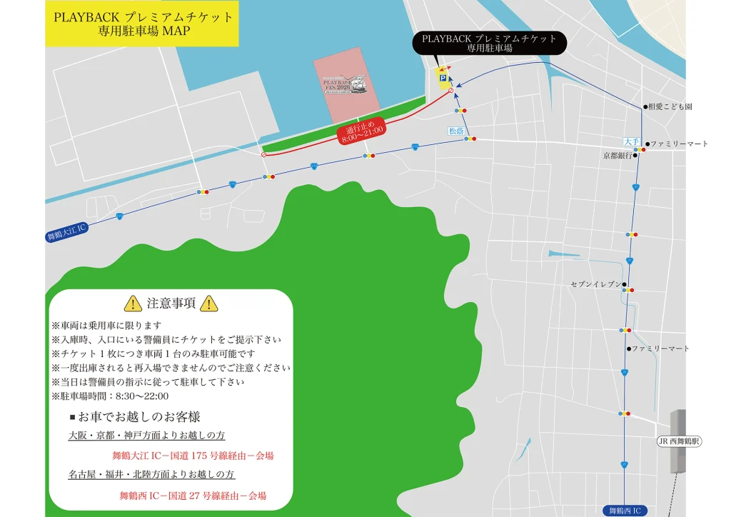 カーナビで会場の住所をセットして頂くと「舞鶴西」もしくは「綾部安国寺」で降りるルートが案内されると思いますが、渋滞緩和のため必ず京都縦貫自動車道の「舞鶴大江IC」で降りるルートでお越し頂き、お帰りの際も必ず舞鶴大江IC〜から高速に乗るルートでお帰りください。ご協力宜しくお願い申し上げます。
